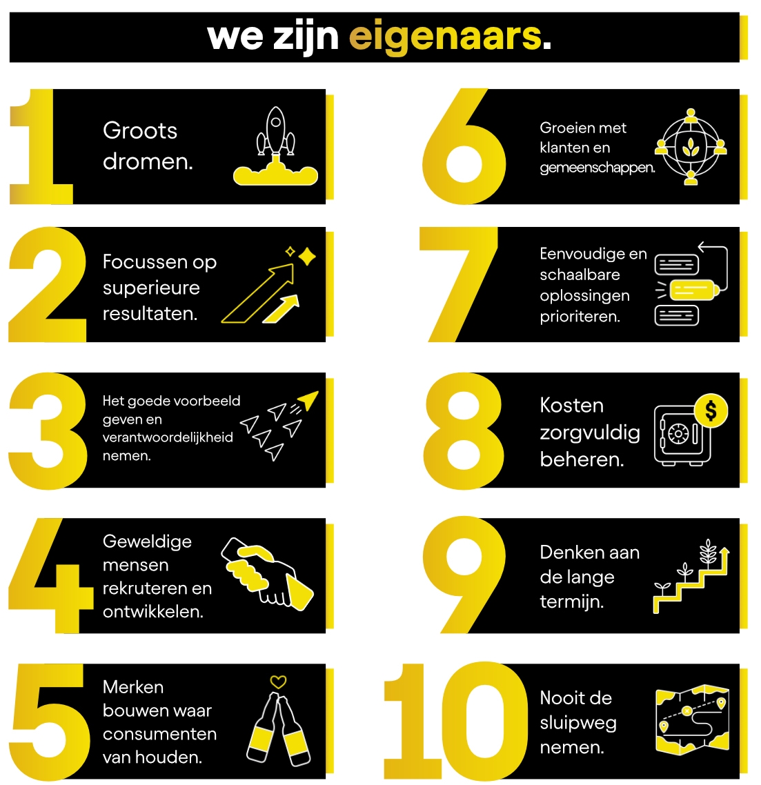 We waarderen onvermoeibare probleemoplossers die verantwoordelijkheid nemen, uitdagingen aanpakken en ambitieuze doelen in resultaten omzetten door veerkracht en hard werk.